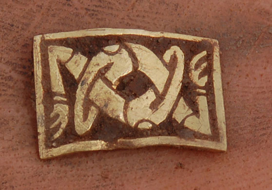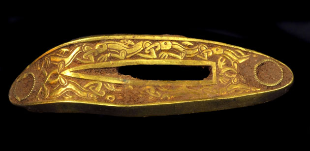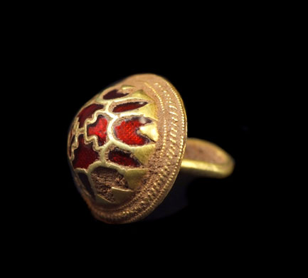 Ruby-red glaze pushing through fretted metal, pure Saxon gold